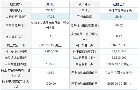 超颖电子2025年10月14日披露的首次公开发行股票并在主板上市发行公告显示,按本次发行价17.08元/股和5,250.0000万股的新股发行数量计算,若本次发行成功,预计公司募集资金总额89,670.00万元,扣除约9,353.78万元(不含税)的发行费用后,预计募集资金净额80,316.22万元。