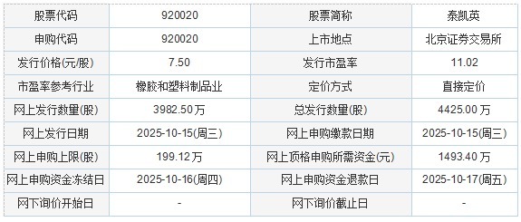 泰凯英2025年10月13日披露的向不特定合格投资者公开发行股票并在北京证券交易所上市发行公告显示,若本次发行成功,预计公司募集资金总额33,187.50万元,扣除发行费用4,143.55万元(不含增值税)后,预计募集资金净额为29,043.95万元。