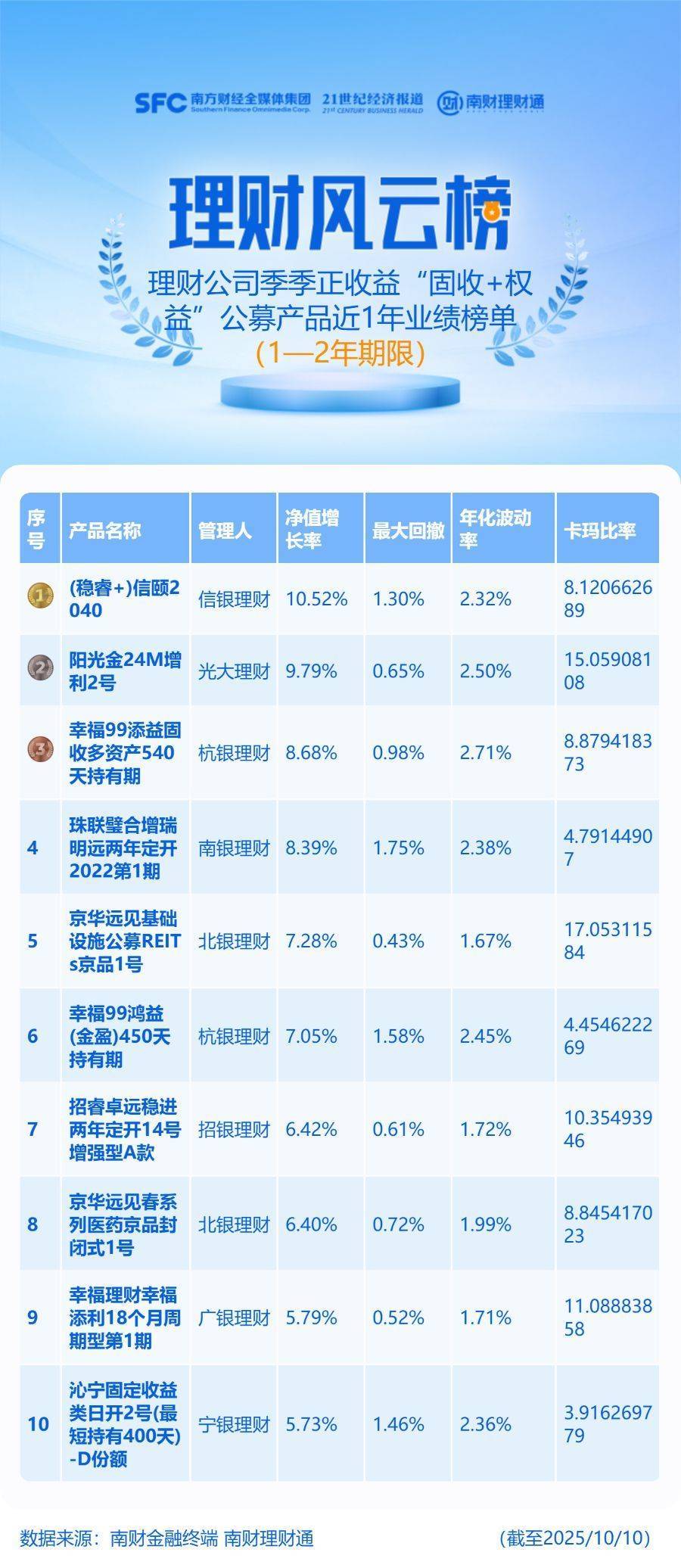 “固收+权益”产品范围为理财公司发行的投资周期在1—2年(含)的公募“固收+权益”产品,且近1年每个完整的自然季季末均为正收益,统计截止日期为2025年10月10日,统计区间为近1年。榜单排名来自理财通AI全自动化实时排名,如您对数据有疑问,请在文末联系助理进一步核实。
